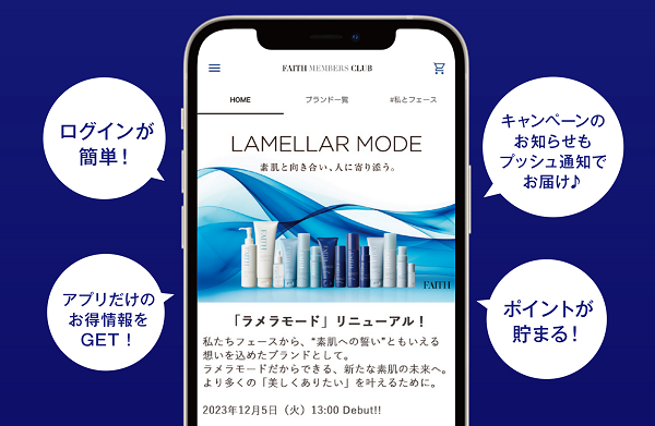ECアプリは、フェースメンバーズクラブに簡単にログイン&購入ができ、来店ポイントや購入ポイントが付与されるなどの機能を搭載しています。
